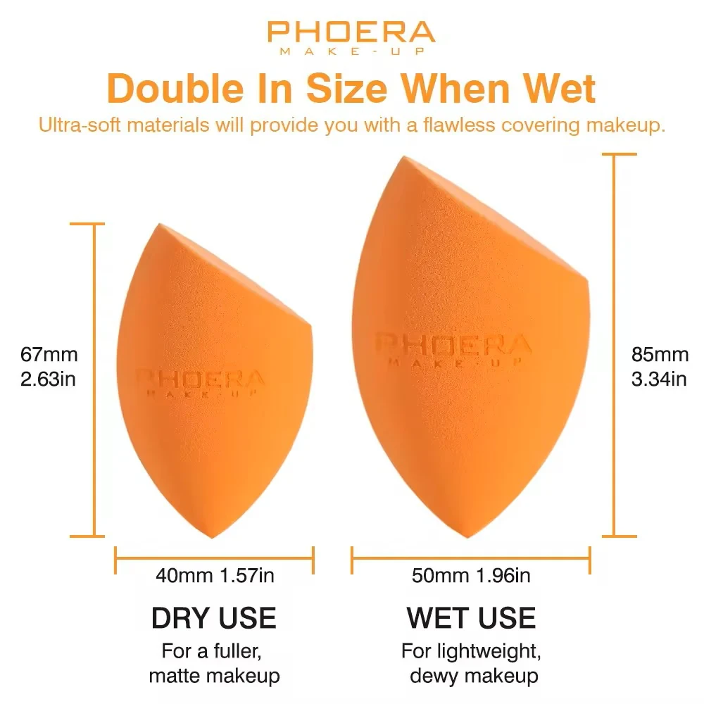 Phoera's beauty blending sponge is shaped in a teardrop form with the added feature of a flat and round surface.